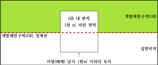 이럴때 이 토지의 전체 면적이 1,000㎡ 이하이고, 개발제한구역에 있는 토지(윗쪽)의 면적이 1,000㎡미만이라면 개발제한구역에 있는 반쪽자리 토지(윗쪽)는 개발제한구역에서 해제할 수 있다.