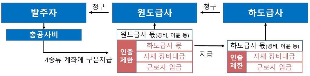 | <건설산업기본법> 제34조(하도급대금의 지급) ⑨ 국가, 지방자치단체 또는 대통령령으로 정하는 공공기관이 발주하는 건설공사(소규모공사 등 국토교통부령으로 정하는 공사는 제외한다)를 도급받은 수급인과 그 하수급인은 「전자조달의 이용 및 촉진에 관한 법률」 제9조의2제1항에 따른 시스템을 이용하여 공사대금[선급금, 기성금, 준공금 및 선지급금(발주자 또는 수급인이 기성금 또는 준공금을 수급인 또는 하수급인에게 지급하기 전에 수급인 또는 하수급인이 자재ㆍ장비대금, 하도급대금 등으로 먼저 지급하는 금액을 말한다)을 모두 포함한다. 이하 이 항에서 같다]을 청구하여 수령하여야 하며, 수령한 공사대금 중 하수급인, 건설근로자, 건설기계대여업자, 가설기자재 대여업자, 건설공사용 부품을 제작하여 납품하는 자 등에게 지급하여야 할 대금을 사용해서는 아니 된다. 이 경우 공사대금 청구ㆍ지급의 방법, 기준 및 절차 등에 필요한 사항은 국토교통부령으로 정한다. |