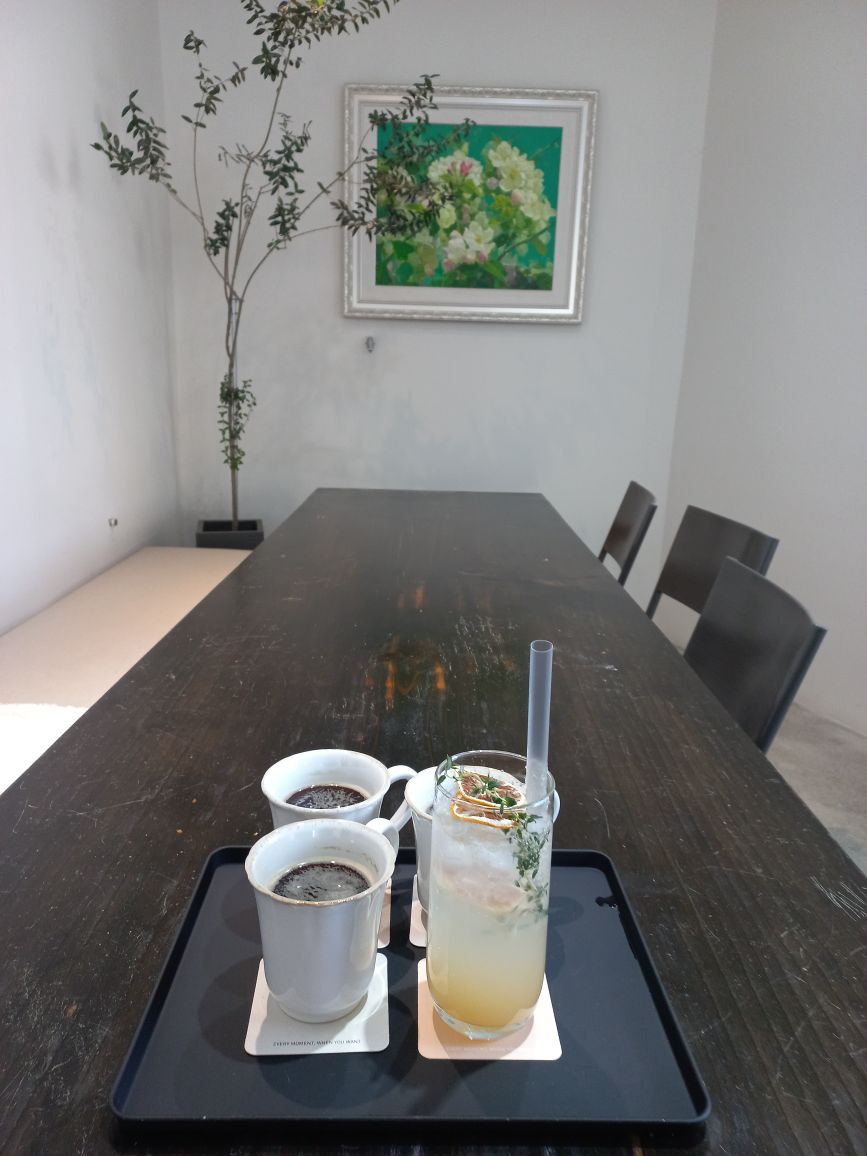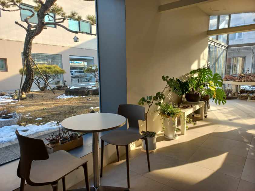 중간 중간에 배치된 나무와 식물, 심플한 의자와 테이블이 주는 안정감과 편안함이 조금 더 머물고 싶어집니다.