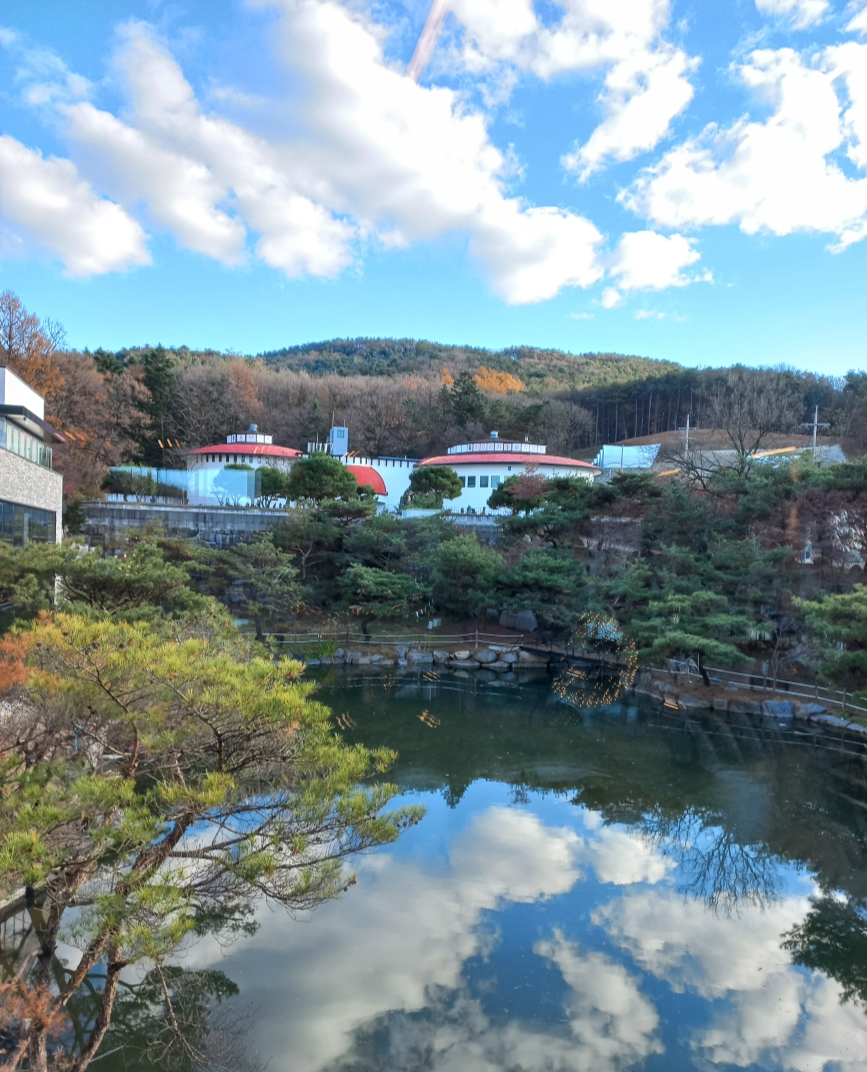 카페 앞에 자리 잡은 연못은 푸른 가을 하늘과 구름을 보기 좋게 담아냈습니다.