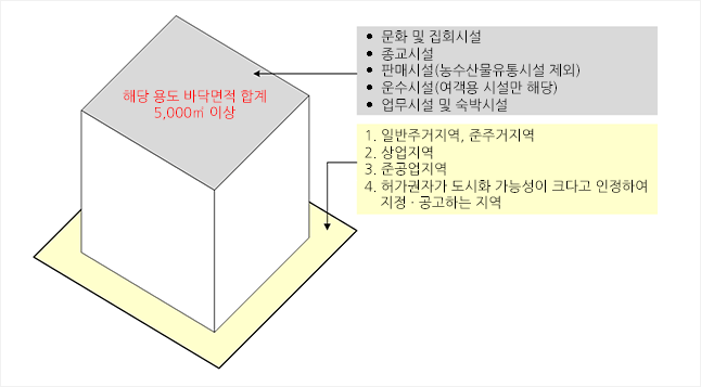 1. 문화 및 집회시설, 종교시설, 판매시설(농수산물유통시설 제외), 운수시설(여객용 시설만 해당), 업무시설 및 숙박시설로서 해당 용도로 쓰는 바닥면적의 합계가 5,000㎡이상인 건축물