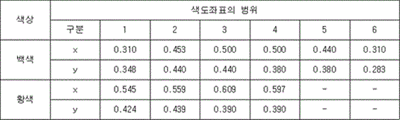 반사체의 색도는 색도측정방법에 따라 측정 시 아래 색도좌표의 범위 내에 들어와야 한다.