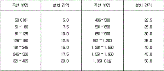 시선유도표지는 연속으로 설치하여 원활한 시선유도 효과가 있도록 하며, 도로의 곡선반경에 따른 설치 간격은 아래 표와 같다. 직선 구간의 최대 설치 간격은 일반도로의 경우 40m, 고속도로는 50m로 한다.