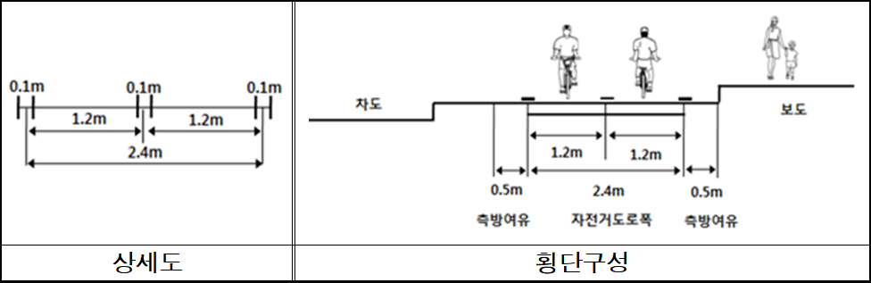 국토교통부, 「자전거이용시설설치 및 관리지침」에 의하면 자전거도로는 자전거전용도로, 자전거보행자겸용도로, 자전거전용차로로 구분하고 있는데 해당 자전거도로의 폭은 아래와 같다.