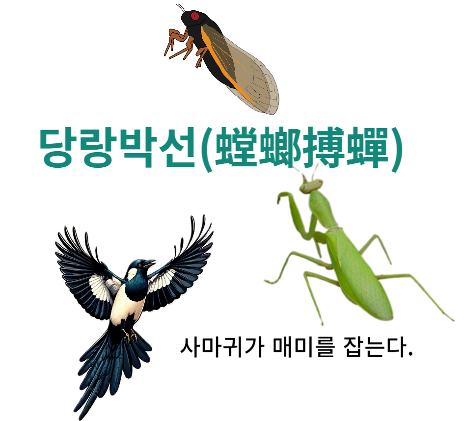 이 뜻을 해석하면 사마귀가 매미를 덮치려고 노리는 데에만 정신이 팔려 참새가 자신을 엿보고 있는 것을 모른다는 말이다.