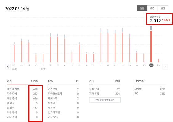 | 티스토리 블로그 1일 방문수 1,500명 돌파와 방문수 증가 이유 (0) | 2022.05.11 |
