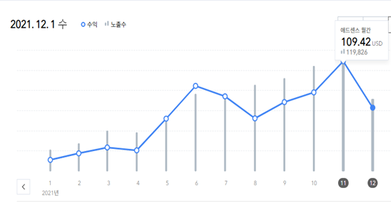 아래 그림을 보면 구글 애드센스 기준금액을 11월에 도달한 것을 볼 수 있습니다.