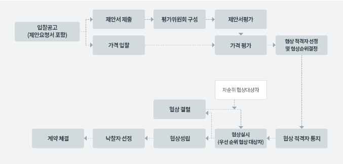# 협상에 의한 계약은 물품·용역 계약을 체결할 때에 계약이행의 전문성 · 기술성 · 창의성 · 예술성,공공시설물의 안전성 등의 이유로 필요하다고 인정되는 경우에는 다수의 공급자들로부터 제안서를 제출받아 평가한 후 협상절차를 통하여 국가 또는 지방자치단체에 가장 유리하다고 인정되는 자와 계약을 체결하는 방식이다.