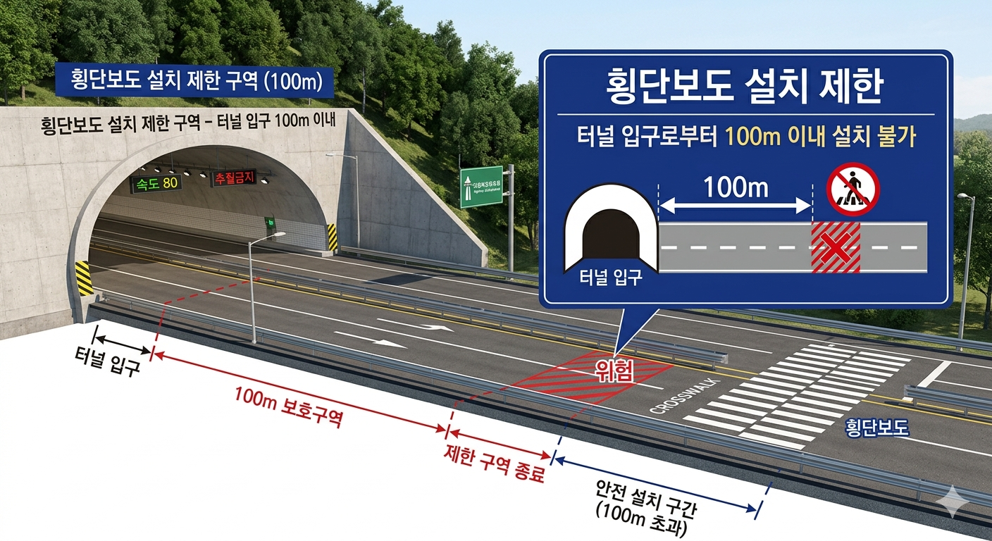 | 도로교통법 시행규칙 제11조 | 육교.지하도 및 다른 횡단보도로부터 아래 거리 이내 - 집산도로 및 국지도로 : 100미터 - 이외 기타 도로 : 200미터 |