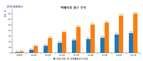 ▶ 2021년 국민 1인당 연간 택배이용횟수는 70.3회, 국내 경제활동인구 1인당 128.4회로 조사됨