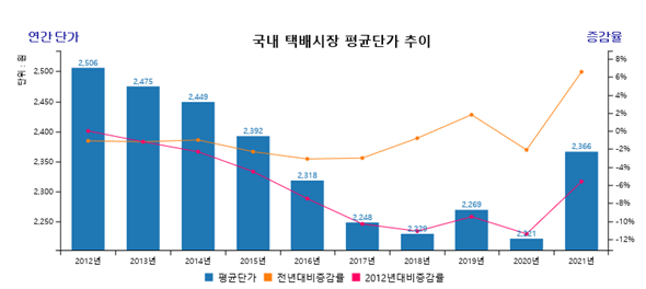 ▶ 2021년 평균 택배단가는 전년보다 145원(6.55%) 증가한 2,366원으로 조사됨