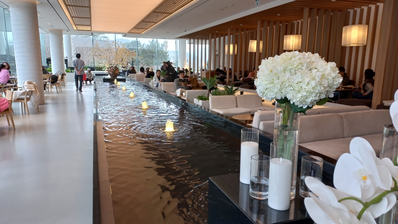 야산을 바라볼수 있는 통창쪽 좌석, 그랜드 피아노 앞 공연장 같은 좌석, 등들 대고 발을 뻗을 수 있는 좌석이 마련되어 있다.